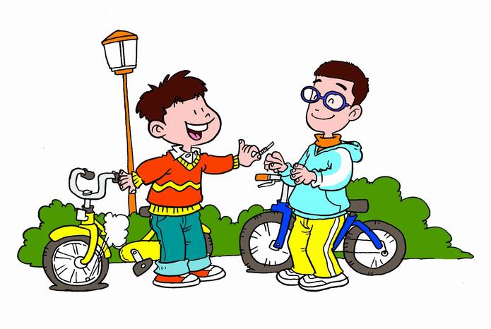我和同学某某某一起骑车出门玩,他的气门芯坏了,我就把我的拔下来给他装上, 我俩一起高高兴兴骑车回家了。