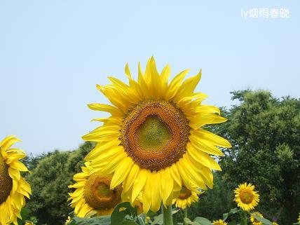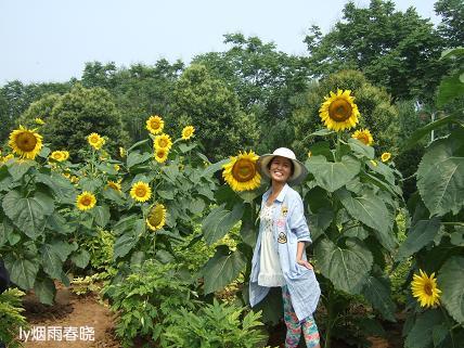 果真,走了一阵,又看到一大片葵花。这片枝干高大,花盘也大,有的已经结果。这片花地,中间还能站人拍照。我正对着花儿拍,过来一中年女士,让我帮她拍照。呵呵,也是一爱美之人,还带了两条长裙,轮换呢。我也是一个人来,于是,我们两个就轮流为对方拍照。不过,我觉得自己的技术比她好点,等她走后,我再看自己相机里她为我拍的,取景什么的,我不太满意。