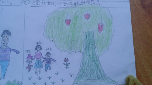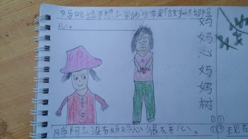 老师也很为阿志的无助感到伤心,因为老师和阿志有着相同的遭遇,她深深的明白阿志那颗可望母爱的心。于是老师想办法联系到了阿志的爸爸,说明情况后,阿志的爸爸笨手笨脚的为阿志做了一颗“妈妈心”,阿志很开心,现在大树上又多了三颗心,它们分别的小苹果、老师和阿志的。因为老师的奶奶也为老师做了一颗“妈妈心”,现在他们都不再孤单,充满了幸福和温馨。