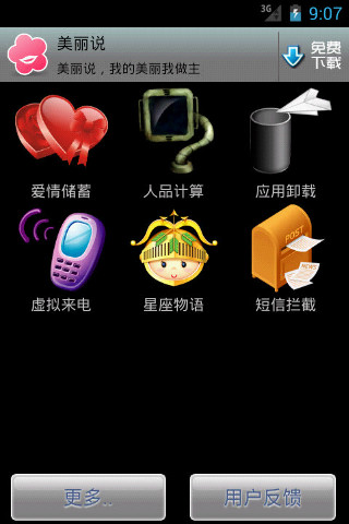 我的android应用 仙剑壁纸:提供本地30多张仙剑5的壁纸,而且支持网上下载图片手机小秘:提供虚拟来电,短信拦截,爱情存储,星座物语,人品测试,应用卸载6个应用饮食助手:你只需要提供年龄,性别就可以为你定制适合你的菜谱,并且提供各类相关信息查询,如食物中毒,相克,孕妇饮食等。备忘便签 :通过桌面部件提供备忘记录,随时随刻提醒你要做的事