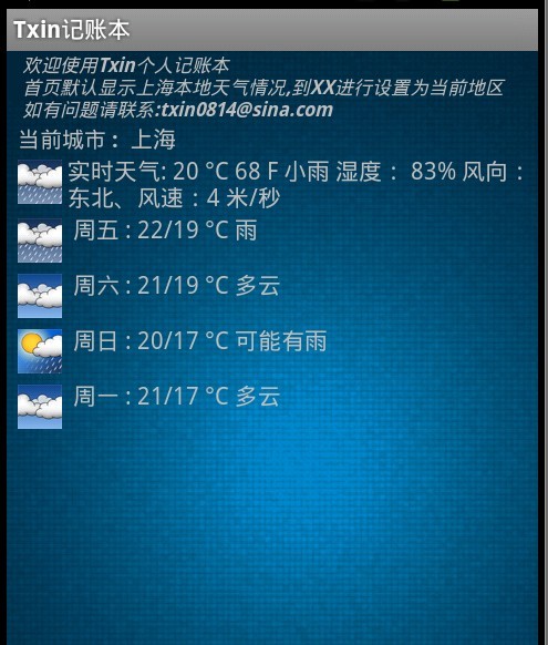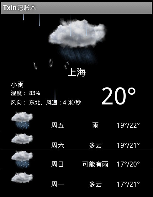 能过URL会得到当前天气和后四天预报天气,通过XML解析,得到图片、温度等值,变显示到自定的界面上即可。