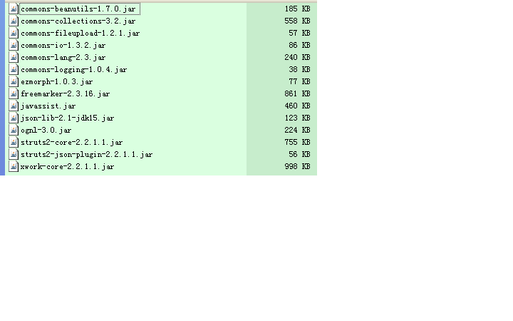 Struts2.2之Json配置 很久没有做web了,温习下struts2的json配置。所需Jar包如下:注意加上javassist.jar,OGNL依赖它。Web.xml配置: