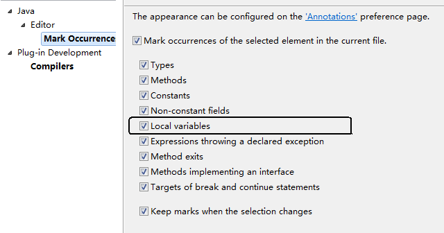 选择:windows-> preferences->java->Editor->Mark Occurences