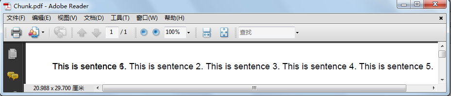import java.io.FileNotFoundException;import java.io.FileOutputStream;import com.itextpdf.text.Chunk;import com.itextpdf.text.Document;import com.itextpdf.text.DocumentException;import com.itextpdf.text.pdf.PdfWriter;public class DocumentExample { public static void main(String[] args) { //创建文本对象 Document document = new Document(); try { //将文本对象写入到指定的文件 PdfWriter.getInstance(document, new FileOutputStream("Chunk.pdf")); //打开文本 document.open(); //放入一段文本块 document.add(new Chunk("This is sentence 1. ")); document.add(new Chunk("This is sentence 2. ")); document.add(new Chunk("This is sentence 3. ")); document.add(new Chunk("This is sentence 4. ")); document.add(new Chunk("This is sentence 5. ")); document.add(new Chunk("This is sentence 6. ")); //关闭文本对象 document.close(); } catch (DocumentException e) { e.printStackTrace(); } catch (FileNotFoundException e) { e.printStackTrace(); } }}