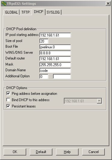 配置tftpd32 dhcp server选项: