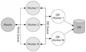 在原来的基础上再加一层Queue, 第一层N个worker从Work Queue获取feed数据, 然后添加到DB Queue, 最后M个(M<N)DB worker从DB Queue中获取数据更新到数据库或者其他地方.