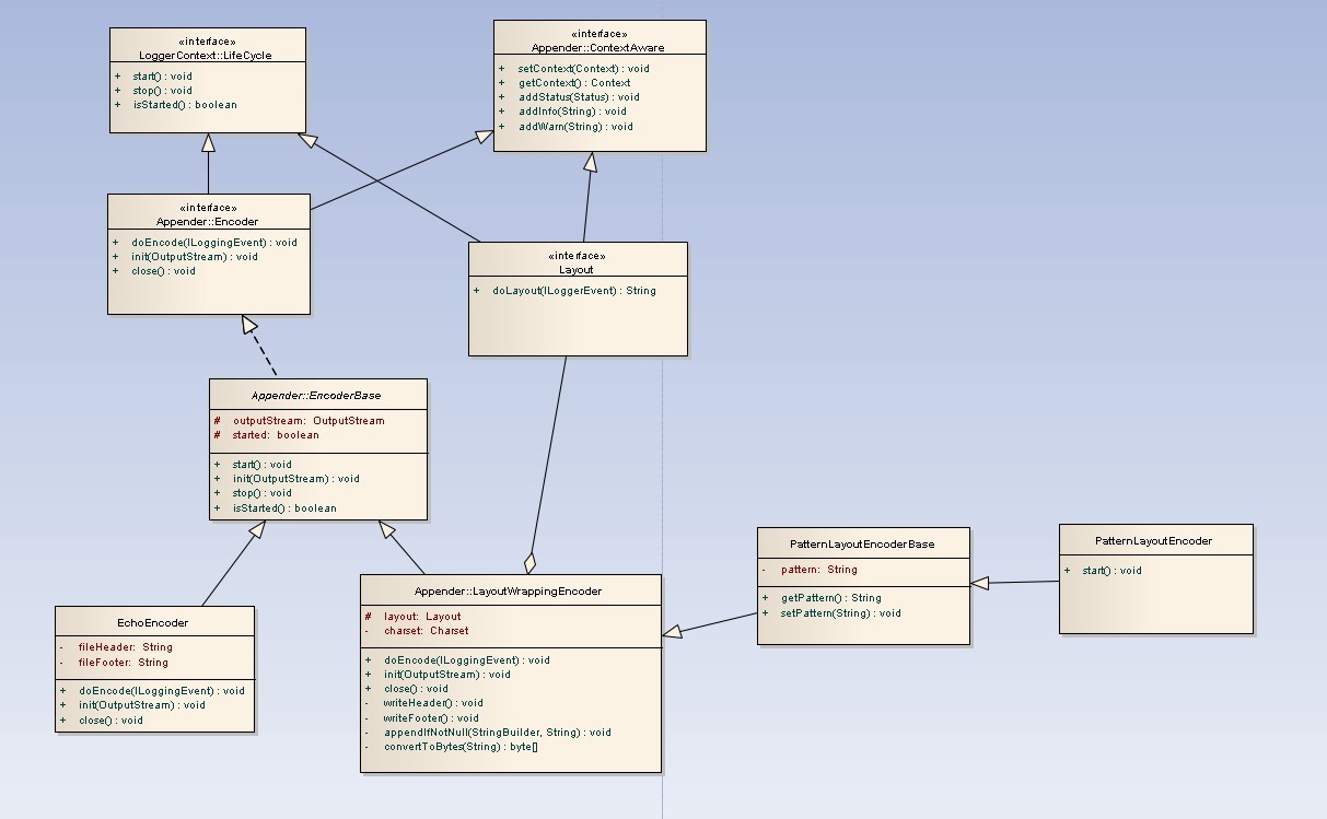 EncoderBase又有若干个具体的实现类,但是实际上真正有意义的就是LayoutWrappingEncoder,这个实现类持有一个Layout字段,委托Layout的doLayout(ILoggingEvent event)方法,来把一个日志事件转换成String。由于基本上只会使用PatternLayoutEncoder,所以在logback.xml里这是无需配置的,如果使用了<encoder>标签,不指定实现类,那么就会默认使用PatternLayoutEncoder