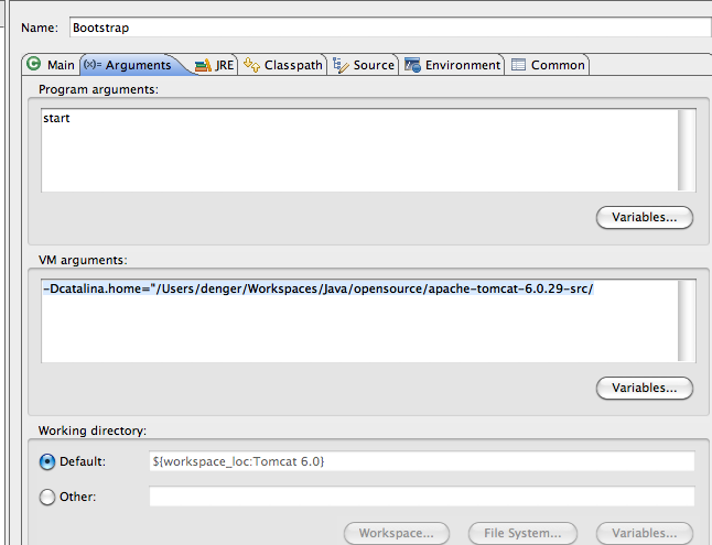 OK了,接下来直接在Eclipse 中的 Debug Configurations 中加入一个启动 Tomcat 的 Appliction. 具体在 Java Application 中加入Main启动项,选择刚才导入的 Tomcat 6.0项目,Main class 填写 org.apache.catalina.startup.Bootstrap 启动类, 然后选择 Arguments ,在 Program arguments 填写 start , 在 VM arguments 中填写 tomcat home 的路径,如:-Dcatalina.home="/Users/denger/Workspaces/Java/opensource/apache-tomcat-6.0.29-src/。 如下图所示: