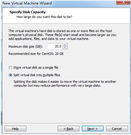 5.为虚拟机分配额硬盘空间大小。当然不是说一开始就分配我们制定的最大空间20G,是会随着你空间的增加而增加的。