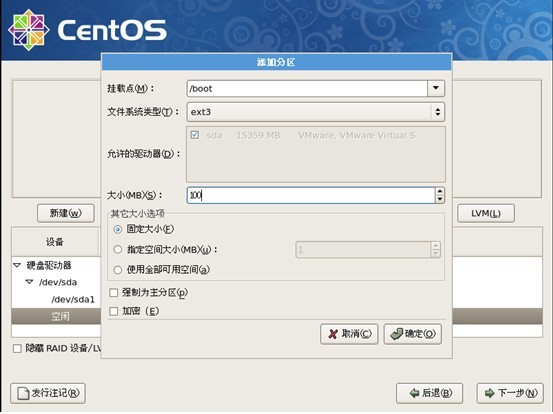 13.这样我们刚分配空间就显示出来了,接下来再点击空闲,然后新建。选择/boot挂载点。这个boot包含了操作系统的内核。一般用户给到100M足够了。