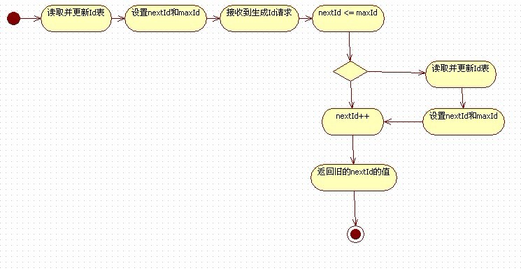 3.使用两个变量来辅助ID的生成,nextId:下一个Id的值, maxId:当前允许的最大Id,当有生成Id请求时,首先判断 nextId > maxId,若条件成立,则重新执行2中的步骤从ids表中读取并更新value,然后将value赋值给nextId,将maxId赋值为value+99,将nextId加一,并返回旧的nextId的值。(注:增加nextId值的时候需要进行线程同步)