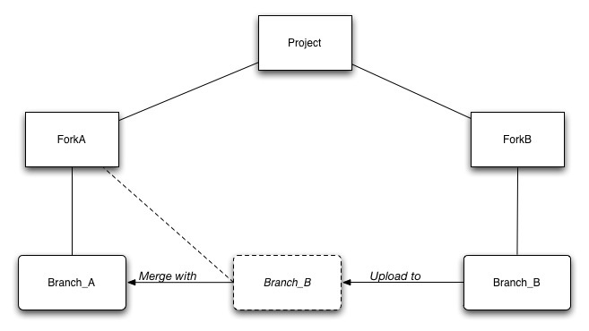 在工作中,我需要将一个项目的fork中的Branch,上传到另一个fork当中,然后再将这个Branch和另一个Branch进行合并: