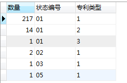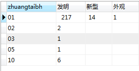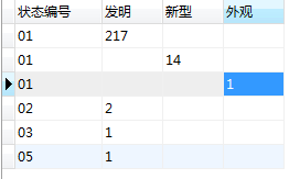 SELECT temp_xx.zhuangtaibh 状态编号, CASE WHEN temp_xx.zhuanlilx = '1' THEN shuliang ELSE '' END AS '发明', CASE WHEN temp_xx.zhuanlilx = '2' THEN shuliang ELSE '' END AS '新型', CASE WHEN temp_xx.zhuanlilx = '3' THEN shuliang ELSE '' END AS '外观' FROM ( SELECTcount(*)shuliang,j.zhuangtaibh,a.zhuanlilx FROMaj_ajxxb aJOIN aj_ztls j ON a.wofangjh = j.wofangjhAND j.zhuangtaibh <> ''AND a.zhuanlilx IN(1, 2, 3)GROUP BY j.zhuangtaibh, a.zhuanlilx )AS temp_xx