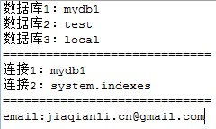 package com.ljq.dao;import java.util.Date;import java.util.HashMap;import java.util.List;import java.util.Map;import java.util.Set;import java.util.UUID;import com.mongodb.BasicDBObject;import com.mongodb.DB;import com.mongodb.DBCollection;import com.mongodb.DBObject;import com.mongodb.Mongo;/** * Mongodb connect & insert & query simple example * @author jiaqianli.cn@gmail.com */public class DbTest {public static void main(String[] args) throws Exception{/* The Mongo object instance actually represents a pool of connections to the database; you will only need one object of class Mongo even with multiple threads. */// Mongo mongo = new Mongo();Mongo mongo = new Mongo("127.0.0.1");List<String> list = mongo.getDatabaseNames();// 打印数据库名字int index = 0;for (String db : list) {System.out.println("数据库"+(++index)+":"+db);}System.out.println("=============================");DB db = mongo.getDB( "mydb1" );Set<String> colls = db.getCollectionNames();// 打印mydb1中的链接index = 0;for (String s : colls) { System.out.println("连接"+(++index)+":"+s);}System.out.println("=============================");// 获取某个链接DBCollection collection = db.getCollection("mydb1");Map<String, Object> data = new HashMap<String, Object>();data.put("_id", UUID.randomUUID());data.put("name", "lijiaqian2011");data.put("email", "jiaqianli.cn@gmail.com");data.put("address", "BeiJing China");data.put("company", "BeiJing Boeh Technology");data.put("salary", 6000f);data.put("addtime", new Date());BasicDBObject doc = new BasicDBObject();doc.putAll(data);// 插入数据collection.insert(doc);BasicDBObject query = new BasicDBObject();query.put("name", "lijiaqian2011");// 查询数据DBObject mydoc = collection.findOne(query);System.out.println("email:"+mydoc.get("email"));}}