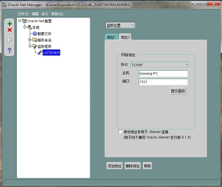 如附件图所示:进入NET MANNAGER将监听程序设置称自己的主机名而不是用IP,一劳永逸 !  在oracle\product\10.2.0\db_2\NETWORK\ADMIN\listener.ora :