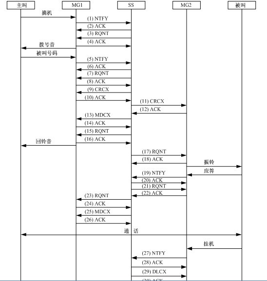 (1)主叫摘机,MG1向SS发NTFY命令,报告主叫摘机事件。