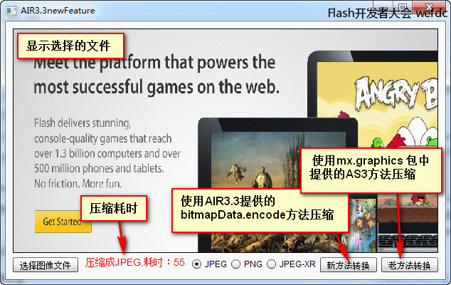 我使用AIR 3.3 beta1(它和Flash Player 11.3功能相同)写了一个demo来测试新加入的bitmapData.encode方法的性能。实际的性能令人满意: