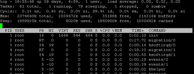 第3行:显示CPU的总负载,每个项目可使用(?)查看。需要观察的是id(idle)的数值,一般来说,它应该接近100%,表示系统资源使用的很少。