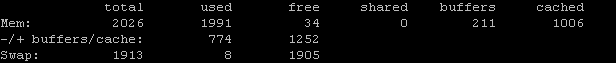 Mem行显示物理内存量,Swap是虚拟内存量,total是总量,used是已用的量,free是剩余可用的量。后面的shared/buffers/cached是在易用的量中,用来进行缓冲及缓存。