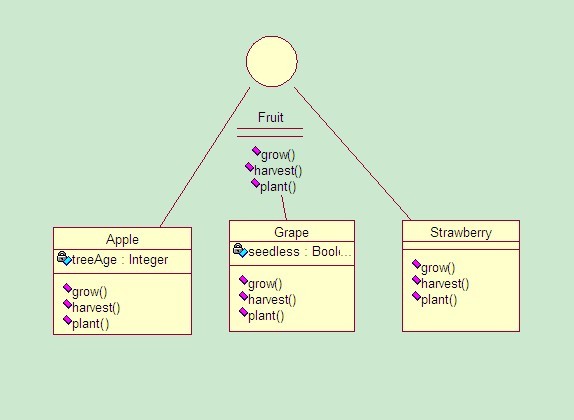 水果接口规定出所有的水果必须实现的接口,包括任何水果类必须具备的方法:种植plant(),生长grow(),收获harvest().如下图: