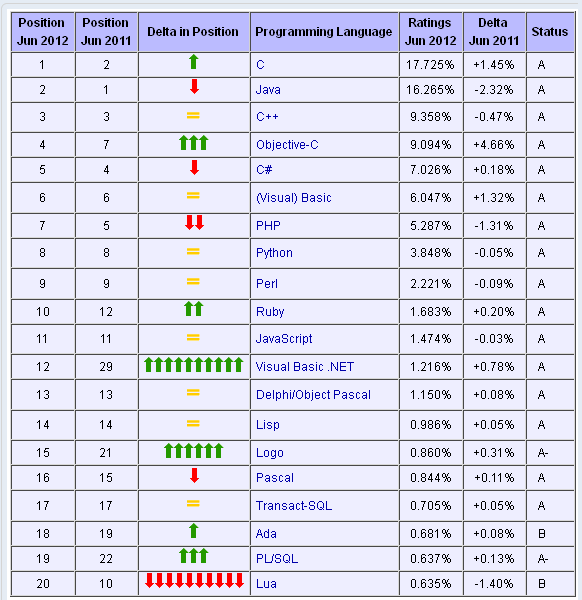2012年6月编程语言排行榜 Top 20 具体榜单: