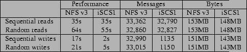 To measure the impact of reads, we create a 128MB file. We then empty the cache and read the file sequentially in 4KB chunks. For random reads, we create a random permutation of the 32K blocks in the file and read the blocks in that order. We perform this experiment first for NFS v3 and then for iSCSI. Table 4 depicts the completion times, network message overheads and bytes transferred in the two systems. As can be seen, for sequential reads, both NFS and iSCSI yield comparable performance. For random reads, NFS is slightly worse (by about 15%). The network message overheads and the bytes transfered are also comparable for iSCSI and NFS.