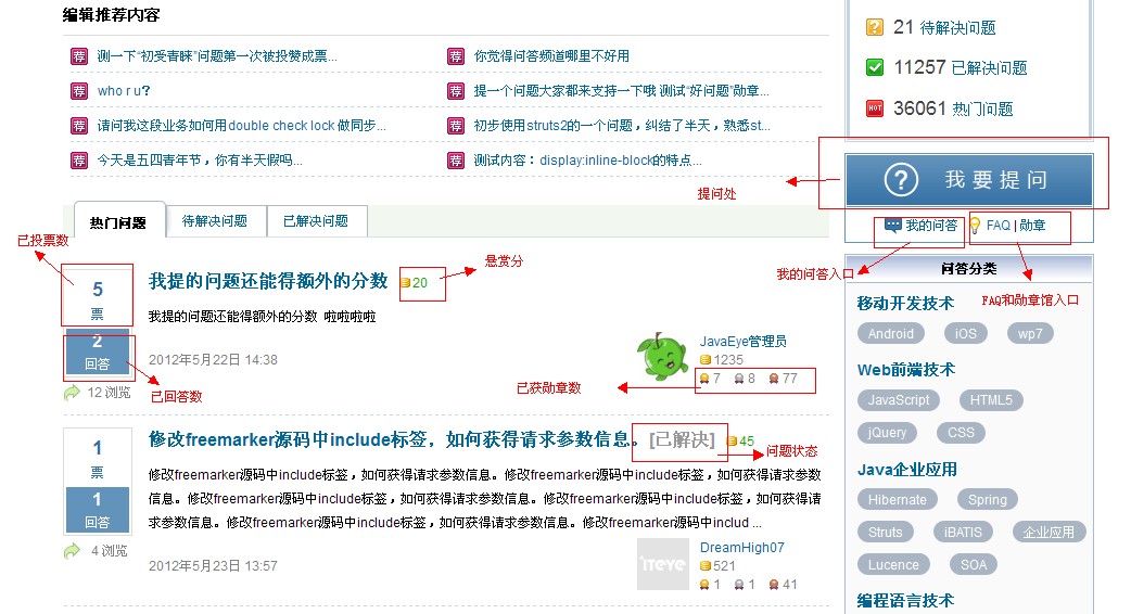 但随着互联网和IT技术的不断发展,我们也发现原来的问答频道无论从功能上还是用户体验上都有很大空间需要改进,因此我们调研了国内外近期一批优秀的问答型产品,吸取它们的成功经验,结合ITeye问答频道自身的特点,进行了此次改版,希望能够为广大用户带来更多的便利,提供更好的问答服务。