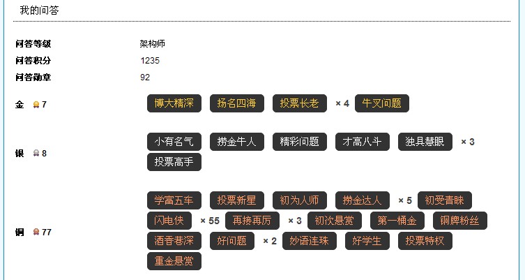 本次改版共推出35款勋章,分为金银铜三个等级,按内容可分为成长型勋章和独立勋章两种。勋章大家一定都不会陌生了,它是您在问答频道获得的各种荣誉的象征。