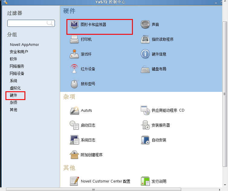 SUSE Linux 下改变系统分辨率 今天在suse linux 下装oracle,做好一切配置工作之后进行oracle安装,打开oralce页面后出现纠结的一幕, 下一步(next)标签始终被屏蔽底部挡住,发现分辨率不对,修改分辨率: 1、root账户登陆。进入yast,选择“硬件”-->“图像卡和监视器“ 如下图 2、进入之后 修改分辨率为当前1023*768,保存退出 即可,如下图
