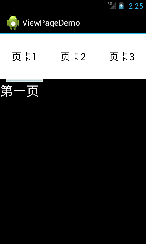 public class ViewPageDemoActivity extends Activity {private ViewPager mPager;// 页卡内容private List<View> listViews; // Tab页面列表private ImageView cursor;// 动画图片private TextView t1, t2, t3;// 页卡头标private int offset = 0;// 动画图片偏移量private int currIndex = 0;// 当前页卡编号private int bmpW;// 动画图片宽度MyPagerAdapter adapter;LayoutInflater mInflater;/** Called when the activity is first created. */@Overridepublic void onCreate(Bundle savedInstanceState) {super.onCreate(savedInstanceState);setContentView(R.layout.main);Log.i("Viewpage","--onCreate--");initImageView();initTextView();initPageView();}private void initPageView() {mInflater = getLayoutInflater();listViews = new ArrayList<View>();listViews.add(mInflater.inflate(R.layout.item1, null));listViews.add(mInflater.inflate(R.layout.item2, null));listViews.add(mInflater.inflate(R.layout.item3, null));adapter = new MyPagerAdapter(listViews);mPager = (ViewPager) findViewById(R.id.vPager);mPager.setAdapter(adapter);mPager.setCurrentItem(0);mPager.setOnPageChangeListener(new MyOnPageChangeListener());}private void initTextView() {t1 = (TextView) findViewById(R.id.text1);t2 = (TextView) findViewById(R.id.text2);t3 = (TextView) findViewById(R.id.text3);t1.setOnClickListener(new MyOnClickListener(0));t2.setOnClickListener(new MyOnClickListener(1));t3.setOnClickListener(new MyOnClickListener(2));}private void initImageView() {cursor = (ImageView) findViewById(R.id.cursor);bmpW = BitmapFactory.decodeResource(getResources(), R.drawable.slide).getWidth();// 获取图片宽度DisplayMetrics dm = new DisplayMetrics();getWindowManager().getDefaultDisplay().getMetrics(dm);int screenW = dm.widthPixels;// 获取分辨率宽度offset = (screenW / 3 - bmpW) / 2;// 计算偏移量Matrix matrix = new Matrix();matrix.postTranslate(offset, 0);cursor.setImageMatrix(matrix);// 设置动画初始位置}private class MyOnClickListener implements View.OnClickListener {private int index = 0;public MyOnClickListener(int i) {index = i;}@Overridepublic void onClick(View v) {// TODO Auto-generated method stubmPager.setCurrentItem(index);}}public class MyPagerAdapter extends PagerAdapter {public List<View> mListViews;public MyPagerAdapter(List<View> mListViews) {this.mListViews = mListViews;}public void destroyItem(View arg0, int arg1, Object arg2) {((ViewPager) arg0).removeView(mListViews.get(arg1));}public void finishUpdate(View arg0) {}@Overridepublic int getCount() {return mListViews.size();}@Overridepublic Object instantiateItem(View arg0, int arg1) {((ViewPager) arg0).addView(mListViews.get(arg1), 0);return mListViews.get(arg1);}@Overridepublic boolean isViewFromObject(View arg0, Object arg1) {return arg0 == (arg1);}@Overridepublic void restoreState(Parcelable arg0, ClassLoader arg1) {}@Overridepublic Parcelable saveState() {return null;}@Overridepublic void startUpdate(View arg0) {}}public class MyOnPageChangeListener implements OnPageChangeListener {int one = offset * 2 + bmpW;// 页卡1 -> 页卡2 偏移量int two = one * 2;// 页卡1 -> 页卡3 偏移量@Overridepublic void onPageSelected(int arg0) {Animation animation = null;switch (arg0) {case 0:if (currIndex == 1) {animation = new TranslateAnimation(one, 0, 0, 0);} else if (currIndex == 2) {animation = new TranslateAnimation(two, 0, 0, 0);}break;case 1:if (currIndex == 0) {animation = new TranslateAnimation(offset, one, 0, 0);} else if (currIndex == 2) {animation = new TranslateAnimation(two, one, 0, 0);}break;case 2:if (currIndex == 0) {animation = new TranslateAnimation(offset, two, 0, 0);} else if (currIndex == 1) {animation = new TranslateAnimation(one, two, 0, 0);}break;}currIndex = arg0;animation.setFillAfter(true);// True:图片停在动画结束位置animation.setDuration(300);cursor.startAnimation(animation);}@Overridepublic void onPageScrolled(int arg0, float arg1, int arg2) {}@Overridepublic void onPageScrollStateChanged(int arg0) {}}}