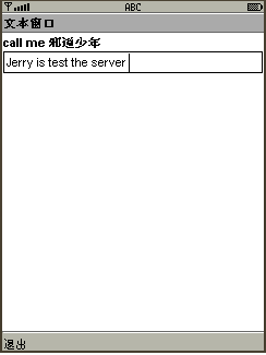 package com.mopietek;import java.io.DataInputStream;import java.io.IOException;import javax.microedition.io.Connector;import javax.microedition.io.HttpConnection;import javax.microedition.lcdui.Command;import javax.microedition.lcdui.CommandListener;import javax.microedition.lcdui.Display;import javax.microedition.lcdui.Displayable;import javax.microedition.lcdui.Form;import javax.microedition.lcdui.TextField;import javax.microedition.midlet.MIDlet;import javax.microedition.midlet.MIDletStateChangeException;public class LoadTextMidlet extends MIDlet implements Runnable,CommandListener{private Display display;private Thread textThread;private Form mainForm,textForm;private TextField textField;public final static Command exitCommand = new Command("退出",Command.EXIT,1);public LoadTextMidlet() {}protected void destroyApp(boolean arg0) throws MIDletStateChangeException {}protected void pauseApp() {}protected void startApp() throws MIDletStateChangeException {display = Display.getDisplay(this);mainForm = new Form("主窗口");textForm = new Form("文本窗口");textField = new TextField("call me 邪道少年","hello",1024,TextField.ANY);textForm.addCommand(exitCommand);textForm.setCommandListener(this);display.setCurrent(mainForm); textThread = new Thread(this); textThread.start();}public void run(){String URL = "http://dev.mopietek.net:8080/waptest03/down/wap.txt";String text = loadText(URL); //获取服务器文本textField.setString(text);textForm.append(textField);display.setCurrent(textForm);}public String loadText(String url){HttpConnection hpc = null;DataInputStream dis = null;try{hpc = (HttpConnection) Connector.open(url);int length = (int) hpc.getLength();byte[]data = new byte[length];dis = new DataInputStream(hpc.openInputStream());dis.readFully(data);return new String(data);}catch(Exception e){e.printStackTrace();return null;}finally{if(hpc != null)try {hpc.close();} catch (IOException e) {// TODO Auto-generated catch blocke.printStackTrace();}if(dis != null)try {dis.close();} catch (IOException e) {// TODO Auto-generated catch blocke.printStackTrace();}}}public void commandAction(Command c, Displayable arg1) {if(c==exitCommand){this.notifyDestroyed();}}}Jerry is test the server
