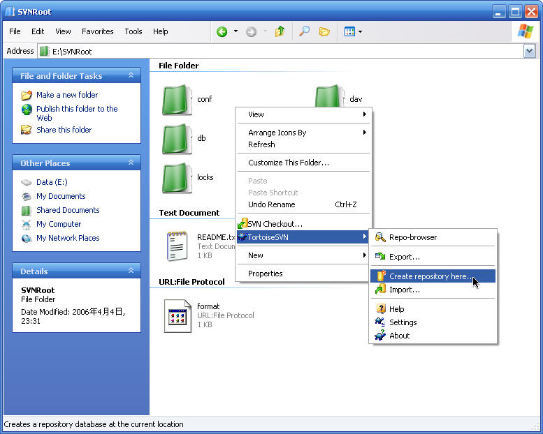 2在目录上,或在在目录内空白处点右键,从TortoiseSVN菜单中选择Create repository here...(在此处创建电子仓库),在选择电子仓库类型后,将会自动生成一些文件和目录.这样就完成了电子仓库的创建,你可以用同样的方法创建多个电子仓库.