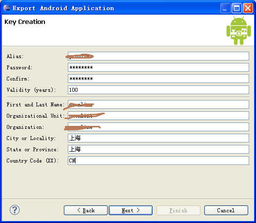 第三步:填写密钥库信息,填写一些apk文件的密码,使用期限和组织单位的信息。