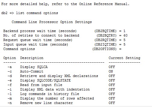 db2 隔离级别-试验准备工作db2命令行下,执行:list command options,如图:注意,Auto Commit缺省是ON,即自动