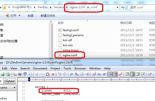 修改文件爱你%NGINX_HOME%\conf\nginx.conf,找到Server项目中的listen,将默认的80端口修改为任意一个没有被占用过的端口如“8011”即可以。就该内如如下图: