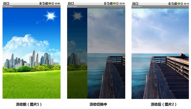 本示例通过ViewFlipper和GestureDetector.OnGestureListener实现自动播放和手势滑屏事件,先看效果: