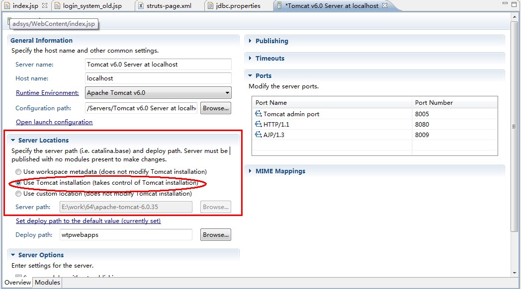 在Server Locations配置中选择第二个选项,use tomcat installation ,保存,重新启动Tomcat服务,访问成功