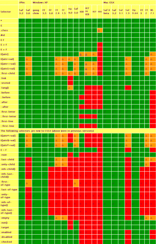 css选择器和主流浏览器的兼容性绿色 / √表示目前支持。橙色/ Δ表示浏览器部分支持当前CSS选择器。红色/ Χ表