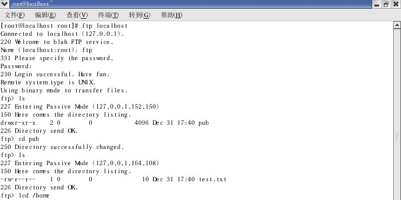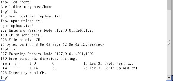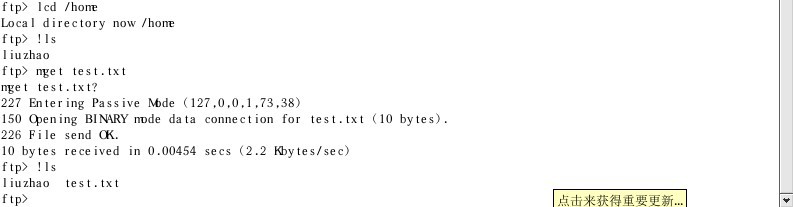 其中ls是查看ftp服务器的ftp目录下信息,可以看到ftp下面有个pub;cd pub是切换到pub子目录,因为要下载的test.txt在它下面,看到了吧;lcd /home是切换系统当前目录命令,切换到home;!ls是查看系统当前目录下的信息;mget是下载命令;最后可以看到home目录下多了个test.txt文件,说明下载下来了.