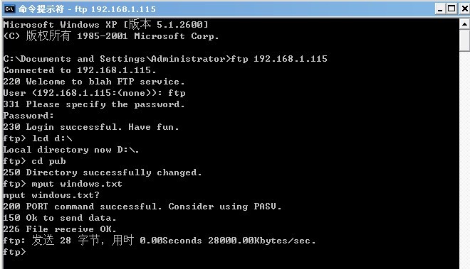 4.用户登陆测试,用户可以用ftp/anonymous,密码不要(直接按Enter),如下是ftp登陆