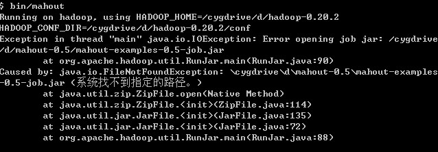 解决方法:在$MAHOUT_HOME/bin/mahout脚本中找到# run it这一行,另起一行,添加如下语句:MAHOUT_JOB=`cygpath -wp $MAHOUT_JOB`