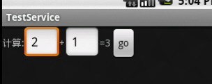 // My AIDL file, named SomeClass.aidlpackage com.zhang.test.service;// See the list above for which classes need// import statements (hint--most of them)// Declare the interface.interface ICallback {// Methods can take 0 or more parameters, and// return a value or void.// Methods can even take other AIDL-defined parameters.//BankAccount createAccount(in String name, int startingDeposit, in IAtmService atmService);// All non-Java primitive parameters (e.g., int, bool, etc) require// a directional tag indicating which way the data will go. Available// values are in, out, inout. (Primitives are in by default, and cannot be otherwise).// Limit the direction to what is truly needed, because marshalling parameters// is expensive.void showResult(int result);}package com.zhang.test.service;import com.zhang.test.service.ICallback;interface IService {void registerCallback(ICallback cb);void unregisterCallback(ICallback cb);}package com.zhang.test.service;import android.app.Service;import android.content.BroadcastReceiver;import android.content.Context;import android.content.Intent;import android.content.IntentFilter;import android.os.Handler;import android.os.IBinder;import android.os.Message;import android.os.RemoteCallbackList;import android.os.RemoteException;import android.util.Log;public class CalculateService extends Service {private static final String TAG = "MainService";public static final String ACTION_CALCUlATE = "action_calculate";private RemoteCallbackList<ICallback> mCallbacks = new RemoteCallbackList<ICallback>();private IService.Stub mBinder = new IService.Stub() {@Overridepublic void unregisterCallback(ICallback cb) {if (cb != null) {mCallbacks.unregister(cb);}}@Overridepublic void registerCallback(ICallback cb) {if (cb != null) {mCallbacks.register(cb);}}}; //这里的BroadcastReceiver实现了Activity主动与Service通信private BroadcastReceiver receiver = new BroadcastReceiver() {@Overridepublic void onReceive(Context context, Intent intent) {String action = intent.getAction();if (ACTION_CALCUlATE.equals(action)) {int first;int second;try {first = Integer.parseInt(intent.getStringExtra("first"));second = Integer.parseInt(intent.getStringExtra("second"));callBack(first, second);} catch (NumberFormatException e) {e.printStackTrace();} catch (Exception e) {e.printStackTrace();}}}};private Handler mHandler = new Handler() {@Overridepublic void handleMessage(Message msg) {//默认计算1+1 callBack(1, 1);super.handleMessage(msg);}};@Overridepublic IBinder onBind(Intent intent) {Log.d(TAG, "onBind");return mBinder;}@Overridepublic void onCreate() {Log.d(TAG, "onCreate");// 这里不知道为什么,直接使用callback方法回调showResult// mCallbacks.beginBroadcast()是0,需要用handler延迟1000毫秒// 也许是在activity中binService太耗时的原因?mHandler.sendEmptyMessageDelayed(0, 1000);super.onCreate();IntentFilter filter = new IntentFilter(ACTION_CALCUlATE);registerReceiver(receiver, filter);}@Overridepublic void onDestroy() {mHandler.removeMessages(0);mCallbacks.kill();super.onDestroy();}private void callBack(int first, int second) {int N = mCallbacks.beginBroadcast();try {for (int i = 0; i < N; i++) {mCallbacks.getBroadcastItem(i).showResult(first + second);}} catch (RemoteException e) {Log.e(TAG, "", e);}mCallbacks.finishBroadcast();}}package com.zhang.test;import android.app.Activity;import android.content.ComponentName;import android.content.Context;import android.content.Intent;import android.content.ServiceConnection;import android.os.Bundle;import android.os.IBinder;import android.os.RemoteException;import android.util.Log;import android.view.View;import android.widget.Button;import android.widget.CompoundButton;import android.widget.EditText;import android.widget.TextView;import com.zhang.test.service.ICallback;import com.zhang.test.service.IService;import com.zhang.test.service.CalculateService;public class CalculateActivity extends Activity {private static final String TAG = "MainActivity";private IService mService;private EditText first;// 第一个计算数private EditText second;// 第二个计算数private Button calculate;// 计算按钮private TextView result;// 计算结果/** Called when the activity is first created. */@Overridepublic void onCreate(Bundle savedInstanceState) {super.onCreate(savedInstanceState);setContentView(R.layout.main);setUpViews();setUpEvents();Intent i = new Intent(this, CalculateService.class);bindService(i, mConnection, Context.BIND_AUTO_CREATE);}private void setUpViews() {first = (EditText) findViewById(R.id.first);second = (EditText) findViewById(R.id.second);calculate = (Button) findViewById(R.id.calculate);result = (TextView) findViewById(R.id.result);}private void setUpEvents() {calculate.setOnClickListener(new CompoundButton.OnClickListener() {@Overridepublic void onClick(View v) {Intent intent = new Intent(CalculateService.ACTION_CALCUlATE);intent.putExtra("first", first.getText().toString());intent.putExtra("second", second.getText().toString());sendBroadcast(intent);}});}@Overrideprotected void onDestroy() {if (mService != null) {try {mService.unregisterCallback(mCallback);} catch (RemoteException e) {Log.e(TAG, "", e);}}// destroy的时候不要忘记unbindServiceunbindService(mConnection);super.onDestroy();}/** * service的回调方法 */private ICallback.Stub mCallback = new ICallback.Stub() {@Overridepublic void showResult(int result) {Log.d(TAG, "result : " + result);CalculateActivity.this.result.setText(result + "");}};/** * 注册connection */private ServiceConnection mConnection = new ServiceConnection() {@Overridepublic void onServiceDisconnected(ComponentName name) {Log.d(TAG, "onServiceDisconnected");mService = null;}@Overridepublic void onServiceConnected(ComponentName name, IBinder service) {Log.d(TAG, "onServiceConnected");mService = IService.Stub.asInterface(service);try {mService.registerCallback(mCallback);} catch (RemoteException e) {Log.e(TAG, "", e);}}};}<?xml version="1.0" encoding="utf-8"?><m
