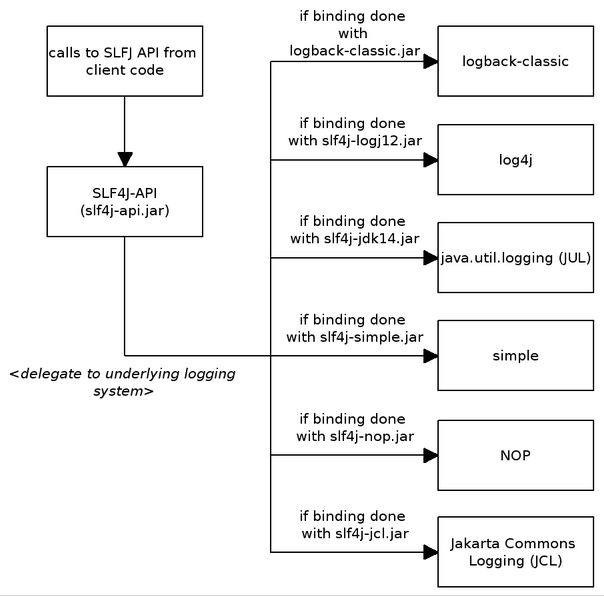 slf4j的实际调用日志在运行时才会动态绑定,基本原理是查找classpath下面的jar包,如果存在slf4j的实现框架,就采用该实现框架。参考下图: