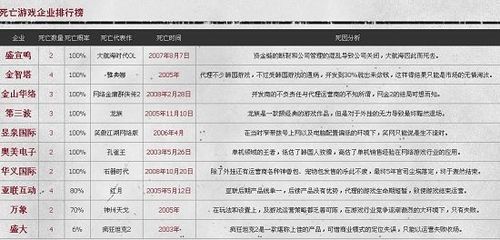 从《死亡游戏企业排行榜》我们发现一个有趣的现象,盛宣鸣、金智塔、金山华络、第三波、昱泉国际 、奥美电子、华义国际这七家企业,旗下所运营游戏,悉数进入《中国网络游戏死亡档案》,死亡概率高达100%,成为网络游戏的坟墓,被成为游戏运营必死企业。