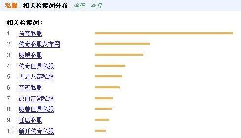 从百度指数对“私服”一词的相关分析,也可以看出网民对私服的关注情况:搜索量最高的是《传奇》,接下来是《魔域》、《天龙八部》、《奇迹》、《热血江湖》、《魔兽世界》、《征途》,都是无一例外是最热门的网络游戏。