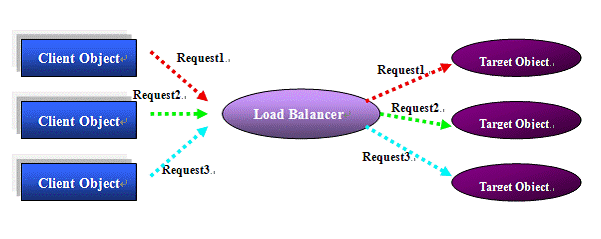 如图1所示,有很多客户端对象并发发送请求到目标对象。负载均衡器则位于调用者和被调用者之间,分发请求到冗余的拥有同样功能的对象上。用此方法可以实现高可用性和高性能。