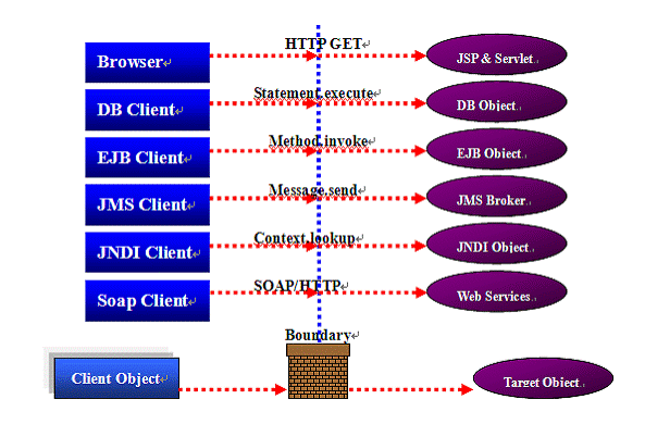 当客户端调用目标对象时,在目标对象容器内执行功能。客户端和目标对象通过标准的网络协议通信。利用这些特性添加机制到方法调用路由中,以实现负载均衡和失效转移。