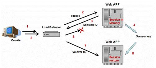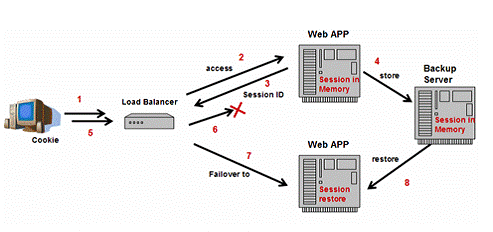 几乎所有的流行的J2EE提供商都在他们的集群产品中实现了HTTPSession失效转移, 确保所有的客户请求可以不因为一些服务器实例的失效而丢失任何会话状态。如图6所示,当浏览器访问一个有状态的web应用(第1,2步),此应用可以在内 存中创建会话对象存储信息以备后用。同时,向浏览器送回HTTPSession ID,用来标记该会话对象(第3步)。浏览器以cookie的方式存储该ID,并会在下次发起请求时送回web服务器。为了支持会话失效转移,会话对象将 在某时某处将它自己备份(第4步)。负载均衡器可以检测失效(第5,6步),分发请求到其他服务器实例(第7步)。因为会话对象已经被备份,新的web服 务器实例可以恢复该会话并正确地处理请求。