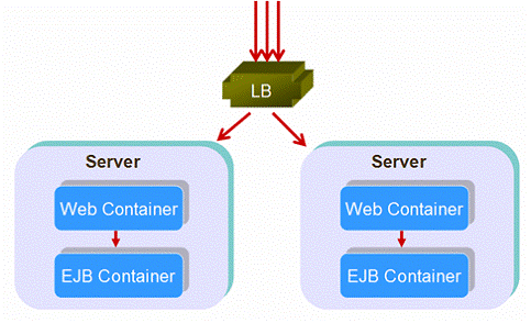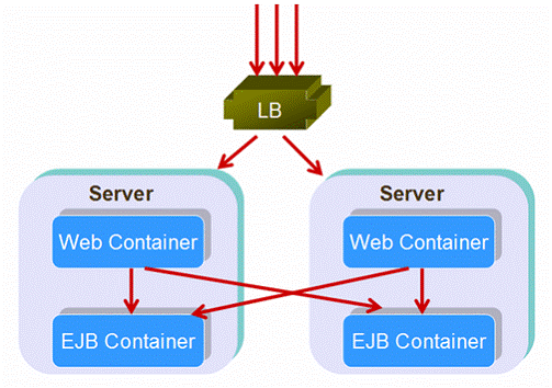 如图20分布式结构,当请求到来时,负载均衡器将它们分发到不同的服务器上的web容器,如请求中包括EJB调用,web容器将重新分发EJB调用到布通的EJB容器。这样,请求被负载均衡和失效转移了两次。