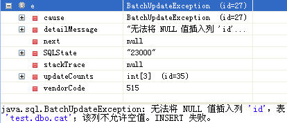 public static void main(String[] args) throws Exception {Properties info = new Properties();info.put(Messages.get(Driver.BATCHSIZE), 30);info.put("USER", "sa");info.put("PASSWORD", "");Connection conn = null;Statement stmt = null;try {Class.forName("net.sourceforge.jtds.jdbc.Driver");conn = DriverManager.getConnection("jdbc:jtds:sqlserver://localhost:1433/test", info);conn.setAutoCommit(false);stmt = conn.createStatement();stmt.addBatch("insert into cat values('11', 'aaa')");stmt.addBatch("insert into cat values(null, 'bbb')");stmt.addBatch("insert into cat values('33', 'ccc')");stmt.executeBatch();conn.commit();} catch (Exception e) {e.printStackTrace();if (conn != null) conn.rollback();} finally {if (stmt != null) stmt.close();if (conn != null) conn.close();}}